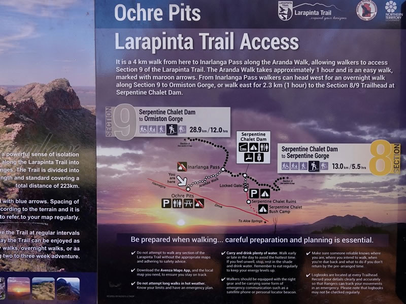Day 3 (Sunday, 30 April 2023) – The Aranda Walk to Inarlanga Pass, and then on Section 9 of the Larapinta Trail to the Serpentine Chalet Dam: Our plan for the day was to see the Ochre Pits, then follow the Aranda Walk to the Inarlanga Pass, after which we’d head east on Section 9 of the Larapinta Trail to the Serpentine Chalet Dam. |