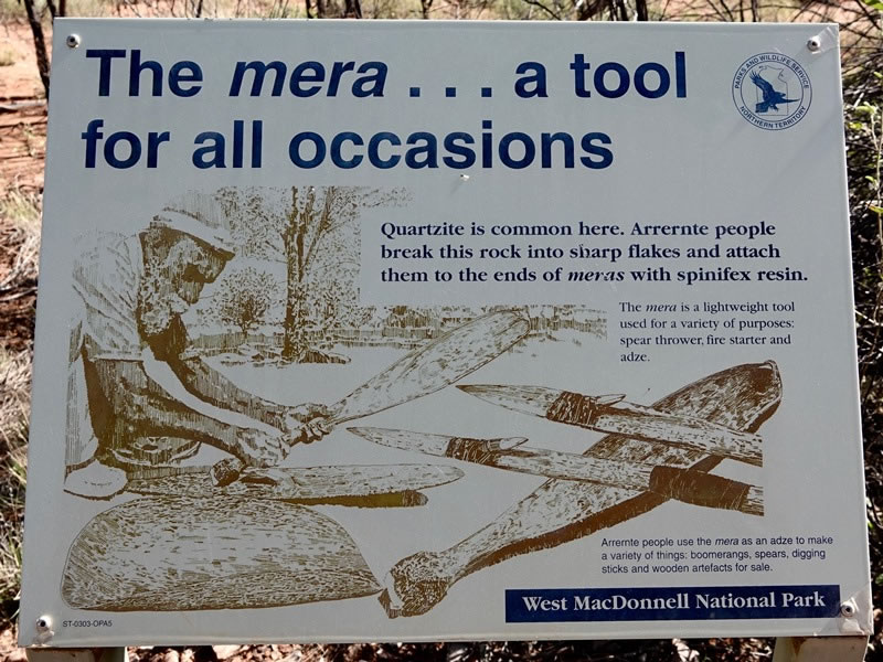 Day 3 (Sunday, 30 April 2023) – The Aranda Walk to Inarlanga Pass, and then on Section 9 of the Larapinta Trail to the Serpentine Chalet Dam: As this information sign notes, Arrernte people used sharp flakes of rocks to make “a variety of things” such as such as boomerangs, spears, and digging sticks; and, … |
