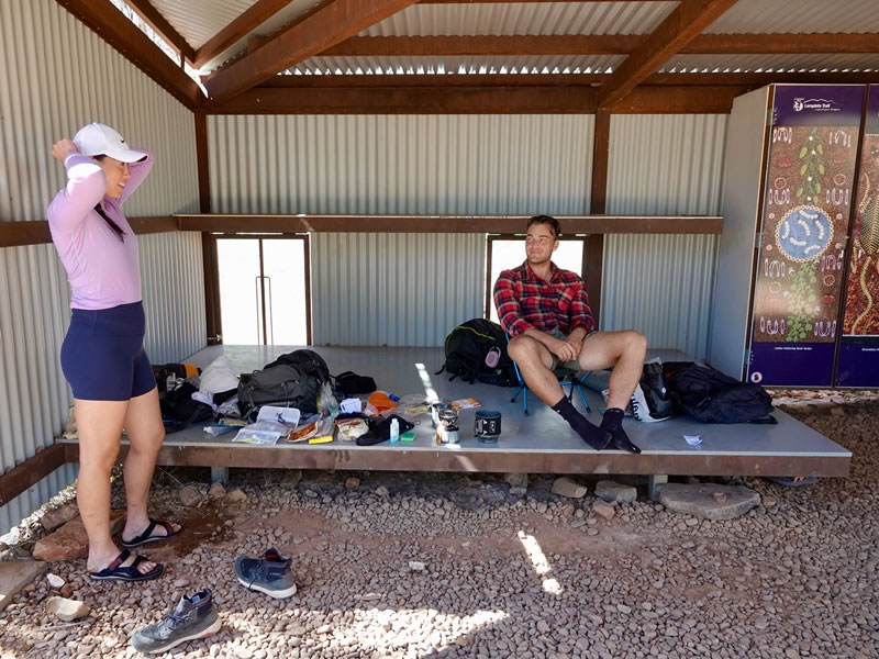 Day 3 (Sunday, 30 April 2023) – The Aranda Walk to Inarlanga Pass, and then on Section 9 of the Larapinta Trail to the Serpentine Chalet Dam: … we didn’t have the shelter to ourselves. When we arrived at the shelter at 12:45 pm, a couple of Larapinta Trail west-to-east through-hikers were already there. |