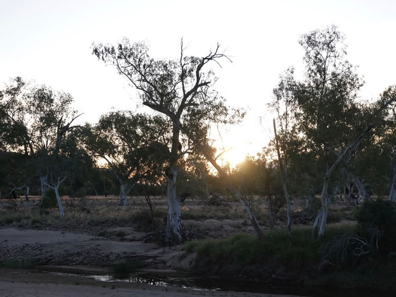 Day 3 (Sunday, 30 April 2023) – The Aranda Walk to Inarlanga Pass, and then on Section 9 of the Larapinta Trail to the Serpentine Chalet Dam: Back at our camp, I took this photograph at six o’clock, looking out across the riverbed just as the sun was setting. |