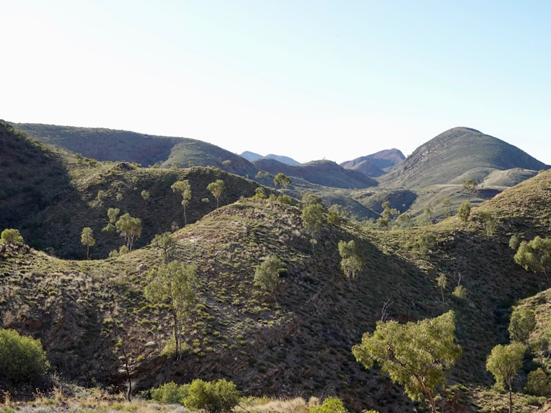 Day 4 (Monday, 1 May 2023) – Section 10 of the Larapinta Trail (i.e., from the Ormiston Gorge to the Finke River): Looking back (i.e., east) after only ten minutes, I spotted Mt Giles, which is the most prominent of the peaks that ring the Ormiston Pound (and which is visible on the horizon in the centre of this photograph). |