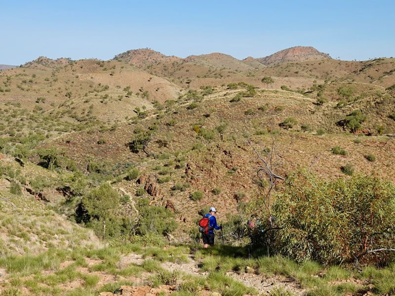 Day 4 (Monday, 1 May 2023) – Section 10 of the Larapinta Trail (i.e., from the Ormiston Gorge to the Finke River): Heather going down into a small valley (while behind her, on the opposite side of the valley, you can see the trail climbing out of the valley). |