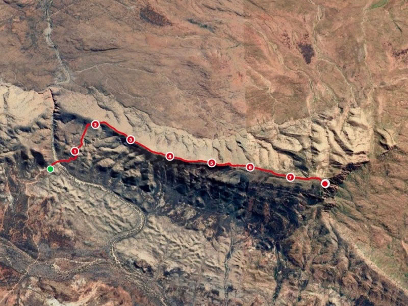Day 5 (Tuesday, 2 May 2023) – Section 12 of the Larapinta Trail (i.e., climbing Mt Sonder): This is my MapMyWalk satellite map showing the route we took to get from the Redbank Gorge carpark to the top of Mt Sonder. It was an out-and-back hike, so we returned to the carpark on precisely the same route. In total, we hiked close to 16 kilometres. |