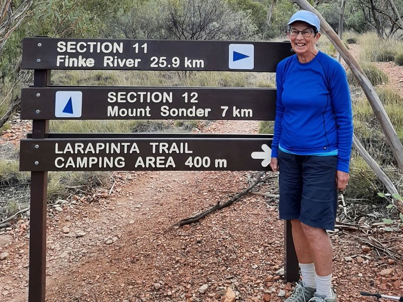 Day 5 (Tuesday, 2 May 2023) – Section 12 of the Larapinta Trail (i.e., climbing Mt Sonder): Ten minutes after I took the previous photograph (which showed Michael walking past the junction of the Larapinta Trail’s Sections 11 and 12), Heather was photographed at the same spot. We had decided that – for the first and only time on our six-day trip – we would split into two groups. One group, to be led by Michael, would climb Mt Sonder. The other group, to be led by Ella, would consist of those who didn’t want to climb Mt Sonder and they would only climb Section 12 of the trail as far as the lookout at the Saddle. It so happened that the second group comprised all the women in our party … |