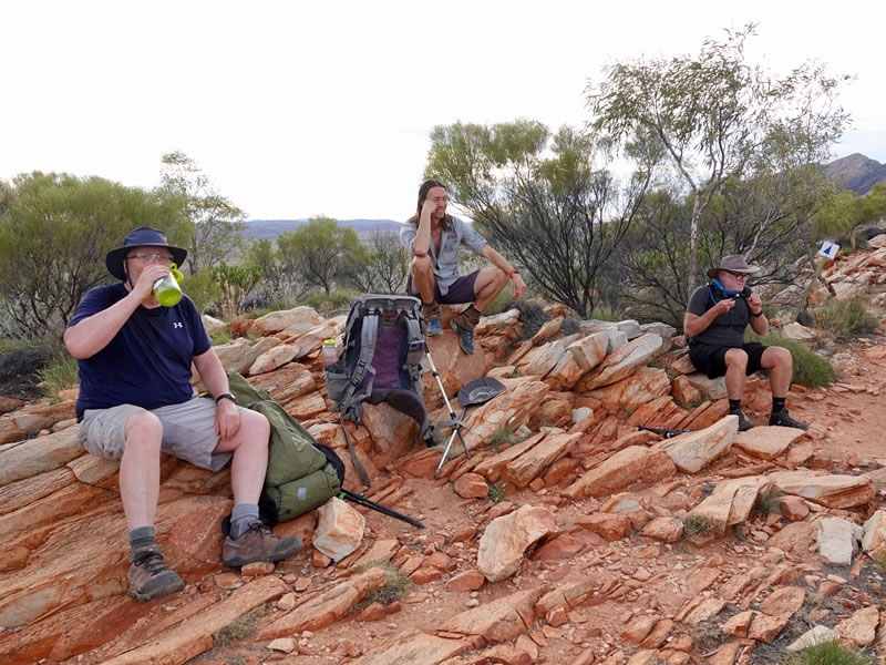 Day 5 (Tuesday, 2 May 2023) – Section 12 of the Larapinta Trail (i.e., climbing Mt Sonder): We stopped at the Saddle lookout for a rest and a drink, joined by Stuart Taylor from Hinton, Alberta (on the left). Stuart hiked the rest of the way to the summit with us. |