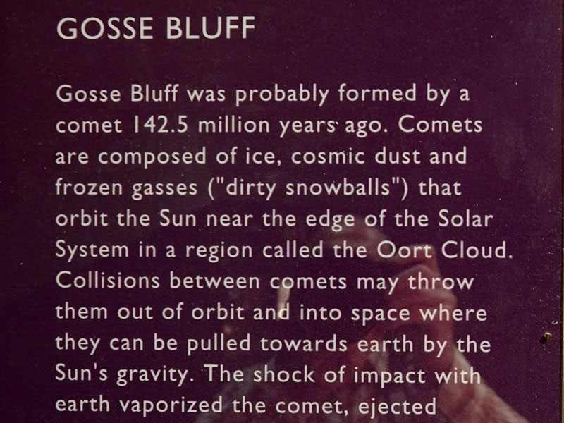 Day 5 (Tuesday, 2 May 2023) – Section 12 of the Larapinta Trail (i.e., climbing Mt Sonder): As this sign that Heather and I had seen on 27 April in the Museum of Central Australia in Alice Springs explains, Gosse Bluff “was probably formed by a comet 142.5 million years ago.” |
