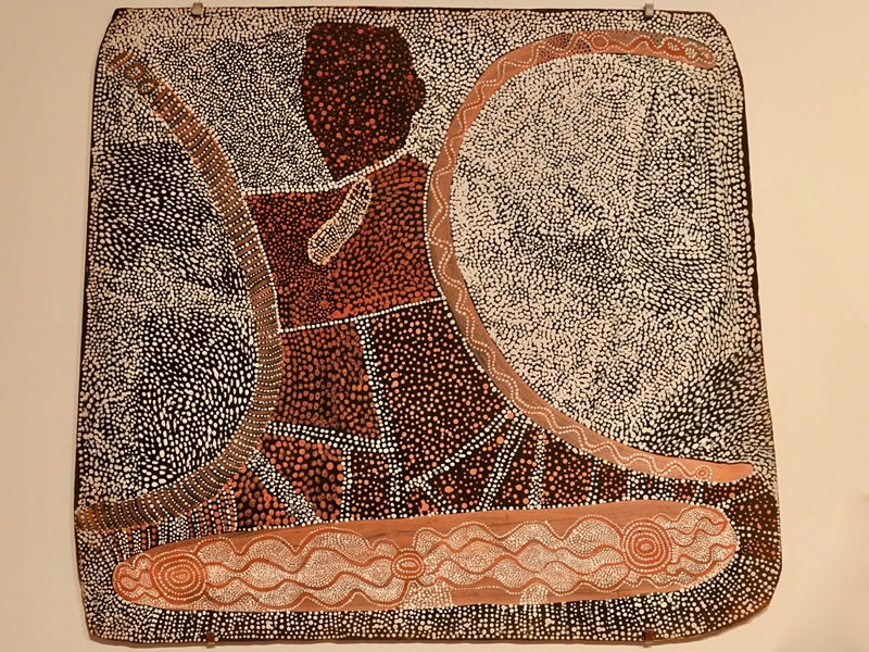 Day 5 (Tuesday, 2 May 2023) – Section 12 of the Larapinta Trail (i.e., climbing Mt Sonder): This is another painting by an Aboriginal artist that I photographed in the Art Gallery of South Australia. It was painted sometime around 1971 or 1972 on composition board by Shorty Lungkata Tjungurrayi, and its title is Man Dreaming. |