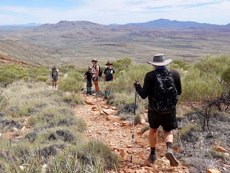 Day 5 (Tuesday, 2 May 2023) – Section 12 of the Larapinta Trail (i.e., climbing Mt Sonder): Half an hour after we left the summit, we met this family of four coming up the mountain. Theirs was an impressive achievement: the younger of the two children (standing immediately to the left of his mother in this photograph) was only seven years old. |