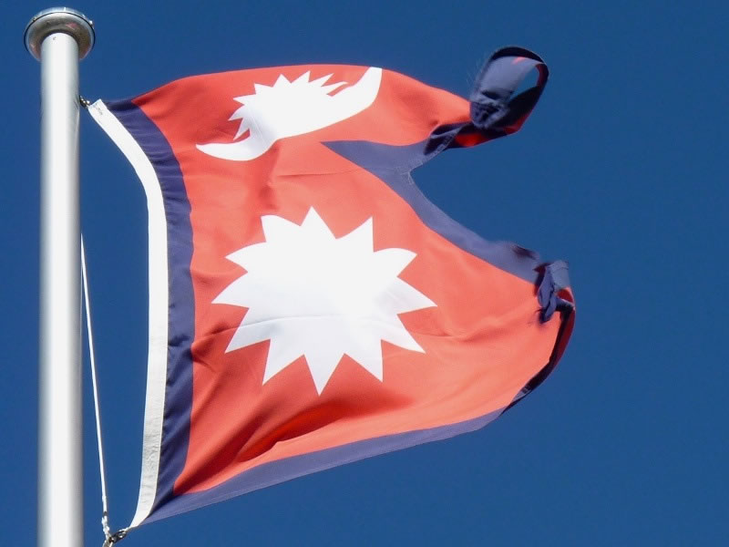 Introduction: Most of my web-albums begin with a photograph of a flag, and this one is no exception. However, the flag is definitely exceptional, because it is the world’s only national flag that isn’t either a rectangle or a square. The upper triangle of Nepal’s flag features a stylised moon, while the larger lower triangle depicts a twelve-pointed sun. |