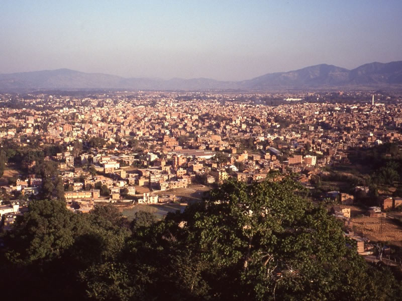 A view out over Kathmandu from the hill on which the Swayambhunath Buddhist temple stands. The population of Kathmandu in 1990 was estimated to be about 400,000 and the country as a whole had around 19 million inhabitants.