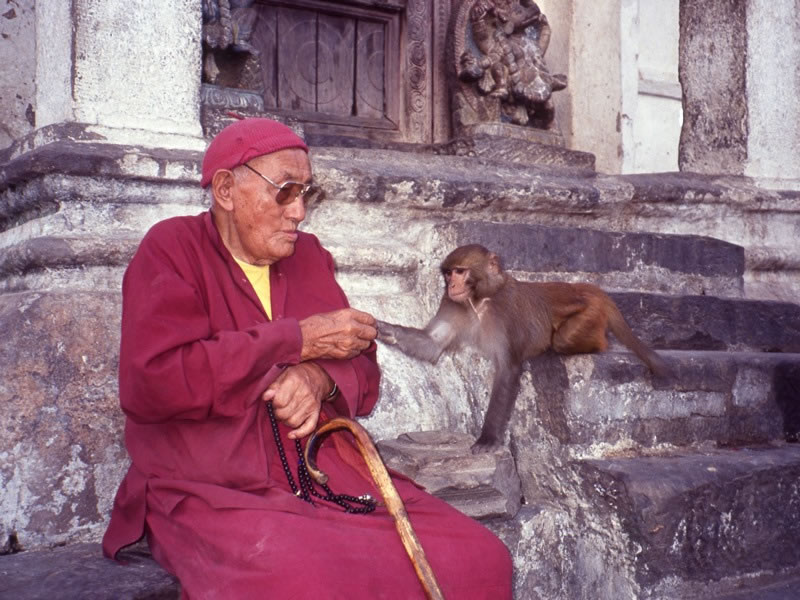 A Buddhist monk and monkey at the Swayambhunath temple.
