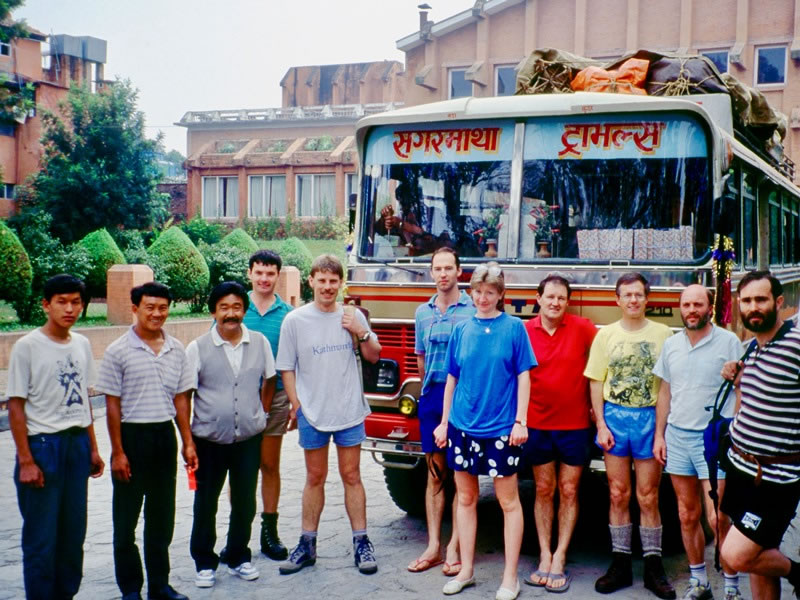 Wednesday, 2 October 1991 – From Kathmandu to Jiri: Prior to leaving the Hotel Kathmandu, we posed for a group photograph. From left to right are: Tenzing, one of the expedition’s two Assistant Sherpas; Ang Pasang, the expedition’s Sirdar (which is a position roughly equivalent to Chief of Staff); Tarchen, the expedition’s Group Leader; Rod Rutledge, a 28-year-old chemical engineer from Gladstone, Queensland; Ralph Baulis, a 31-year-old Telecom technician from Launceston, Tasmania; Geoff Seawright, a 29-year-old software developer from Brisbane; Diane Cowan, a 31-year-old New Zealander, who was living in Melbourne and working for Kone elevators; Mike Curtin, a 48-year-old buyer-manager from Melbourne; Nigel Roberts, a 47-year-old university lecturer from Wellington, New Zealand; Jon Guyver, a 40-year-old parks supervisor from Sydney; and Dave Little, a 39-year-old general practitioner from Terrigal, NSW. Incidentally, Geoff Seawright and Diane Cowan had climbed Kilimanjaro (in 1987 and 1989 respectively) and, as I wrote in my Lobuje East expedition diary, it seemed that there was “a natural progression from Kilimanjaro to Lobuje.” When this photograph was taken, Eric Hodge, a 49-year-old public servant from Canberra, was lying in the back of the bus suffering from the ill-effects of food poisoning. |