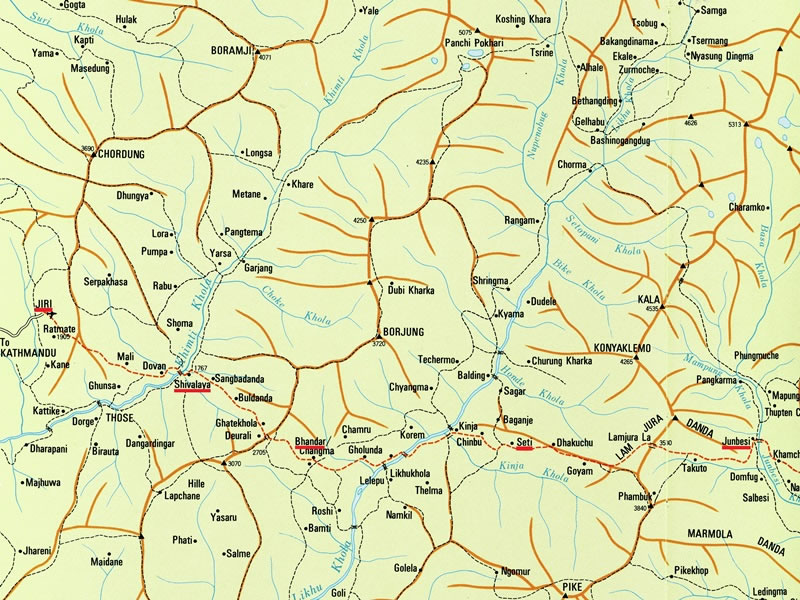 Thursday, 3 October 1991 – From Jiri to Shivalaya: This is a photograph of part of one of the maps in Ryohei Uchida’s Kathmandu to Everest. It shows the route we took to get from Jiri to Junbesi during the first four days of our trek. In addition to Jiri, the name of each evening’s destination – Shivalaya, Bhandar, Seti, and Junbesi – has been underlined. |