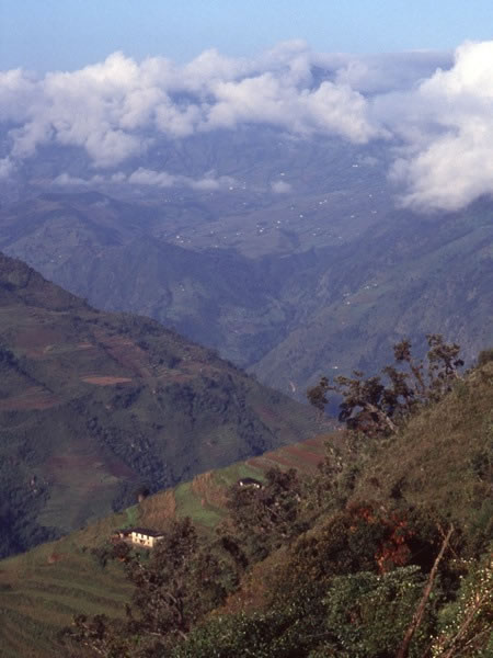 Sunday, 6 October 1991 – From Seti to Junbesi: Before we left Seti, I took this photograph looking back down in the direction of Kinja (which is not visible in this picture). Seti is roughly half-way up a long climb from the Likhu Khola river (at about 1,600 metres) to the Lamjura La (that is, the Lamjura pass), which is 3,530 metres above sea-level and is the highest pass in the Solu region. We had stayed in Seti because, as Ryohei Uchida bluntly put it in his book, Kathmandu to Everest, “since you cannot complete the climb by the end of the day, you should stay over in Seti.” |