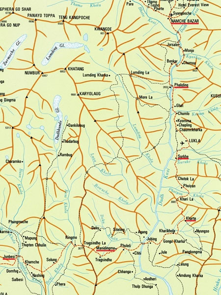 Monday, 7 October 1991 – From Junbesi to Manidingma: This is another photograph of part of one of the maps in Ryohei Uchida’s Kathmandu to Everest. It shows the route we took to get from Junbesi to Namche Bazar during days five to nine of our trek. In addition to Junbesi, the name of each evening’s destination – Manidingma, Kharte*, Surkhe, Phakding, and Namche Bazar – has been underlined. (*: It should be noted that we didn’t really stay in Kharte. We stayed in nearby village called Bupsha, sometimes spelt Bupsa, but it’s not even on the map.) |