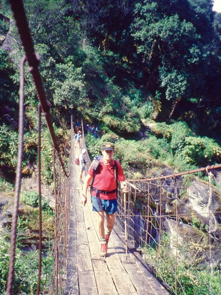 Tuesday, 8 October 1991 – From Manidingma to Bhupsha: We left Manidingma at 7:45 am. An hour-and-a-half later, we reached the Dudh Kosi river. At 1,493 metres above sea-level, the Dudh Kosi was literally our expedition’s low point: even Jiri, the starting point for our trek, was at a higher altitude. The Dudh Kosi was also a turning point for us: after trekking east for five full days, we finally started heading north. This is a photograph of Mike, followed by Ralph and Diane, on the swing bridge across Dudh Kosi river. |