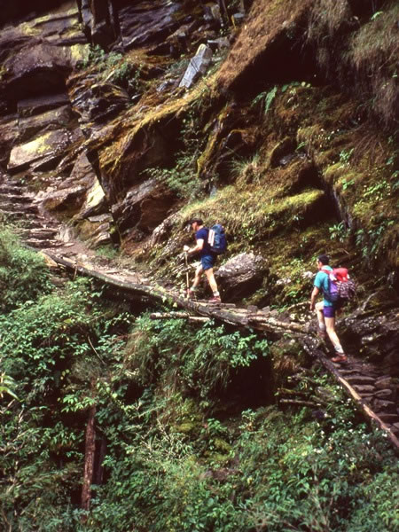 We left Bhupsha at 7:15 am and began climbing up towards the Khari La pass (3,081 metres). In this photograph, Mike (on the left) and Eric are walking along a rather dodgy section of the path.