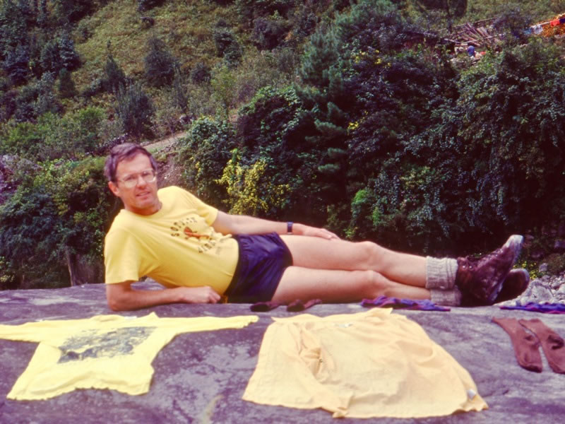 Thursday, 10 October 1991 – From Surkhe to Phakding: Taking advantage of the facts that we had the whole afternoon in Phakding, that it was reasonably sunny, and that the boulders beside the river were warm, I washed some clothes in the river and spread them out on the rocks to dry. However, as I noted in my diary, “the Dudh Kosi was very fast flowing and silty. When my bar of soap fell in, I did not try to retrieve it.” |