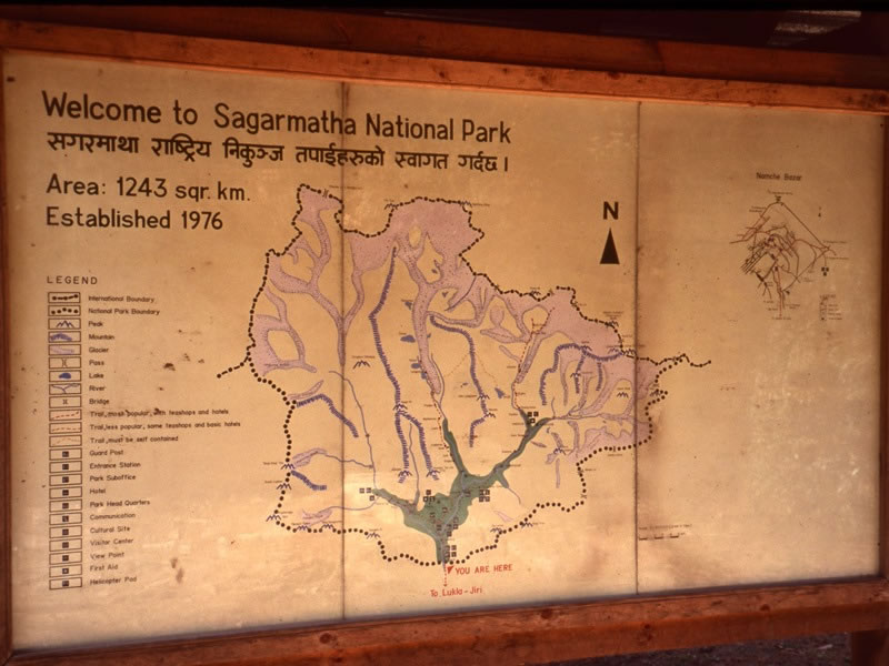 Friday, 11 October 1991 – From Phakding to Namche Bazar: The sign says it all: “Welcome to Sagarmatha National Park”. Despite being the home of the world’s highest mountain, the Sagarmatha National Park is not particularly large. It’s smaller than New Zealand’s Rakiura National Park (which is in Stewart Island / Rakiura) and is only slightly bigger than the Arthur’s Pass National Park. An Australian comparison is also revealing: Tasmania’s Cradle Mountain-Lake St Clair National Park is roughly 25 per cent larger than the Sagarmatha National Park. |