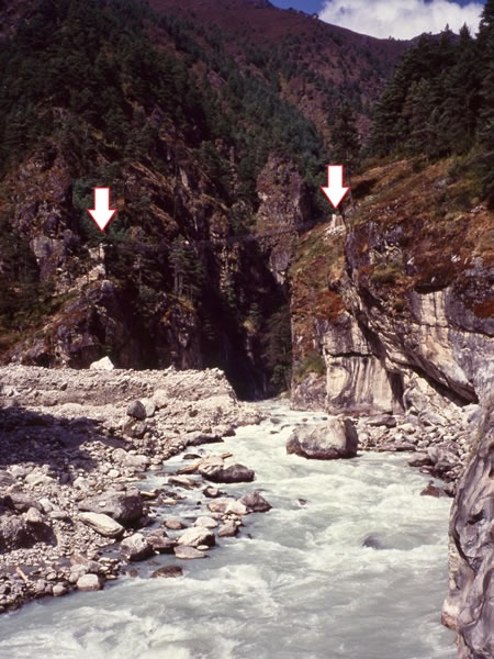Friday, 11 October 1991 – From Phakding to Namche Bazar: In order to reach Namche Bazar, we had to cross the Dudh Kosi one more time. It’s difficult to see the last bridge of the day in this photograph, so I’ve marked its start and finish with red-and-white arrows. |
