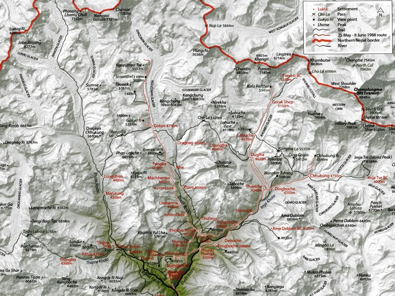 Sunday, 13 October 1991 – From Namche Bazar to Kyangjuma: This is a photograph of one of the many excellent maps in Peter Laurenson’s superb book, Khumbu: Gateway to Everest; Pathways to Kinship. This map also shows where we went after we left Namche Bazar on 13 October and prior to returning to it on 27 October 1991. |