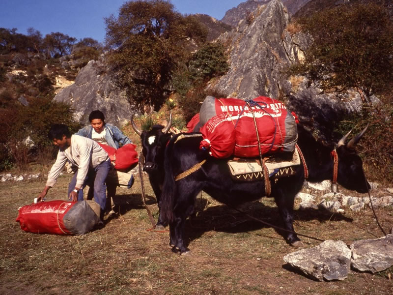 Tuesday, 15 October 1991 – From Kyangjuma to Dole: Most of our expedition’s porters returned to Jiri after we reached Namche Bazar, and for the rest of our time in the Khumbu region the bulk of our gear was carried by two yaks. This is a photograph of the young yak-herders loading our World Expeditions’ gear bags onto the yaks’ backs prior to our departure from Kyangjuma at 8:50 am. |