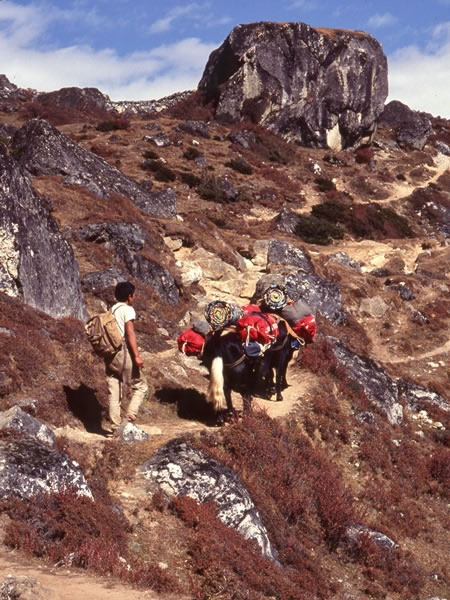 Thursday, 17 October 1991 – From Machhermo to Gokyo: We left Machhermo at 8:37 am. At first we walked round well-contoured hillside paths, and then – as the yaks are doing in this photograph – we trudged slowly up towards the moraine of the Ngozumpa glacier. |