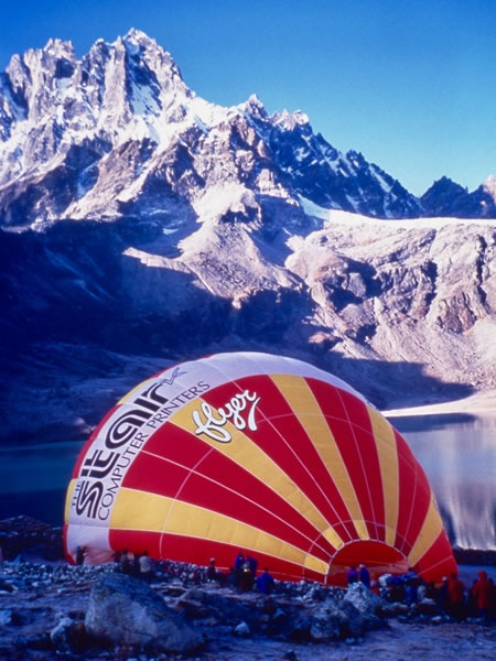 Friday, 18 October 1991 – Based at Gokyo: After arriving in Gokyo on Thursday, 17 October, I wrote in my diary: “The ‘big guns’ in Gokyo are the hot-air balloonists, whom we’ve been hearing about ever since we started our trek – and they’re still here. Millions of dollars have been poured by National Geographic and Star computer-printers into their attempt to hot-air balloon over Everest.” This is the best photograph I have of one their two balloons. It was taken while the balloon was being partially inflated in order to get it into a better position for take-off. |