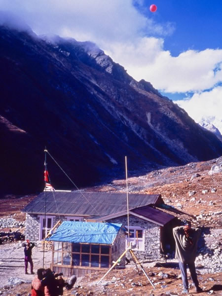 Watching the last of the three weather balloons as it rises above Gokyo.