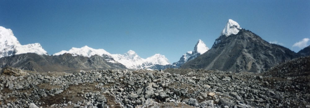 Taken from a spot on the Ngozumpa glacier that was near the fifth Gokyo lake, this is a panoramic photograph looking due east up the Gyubanare glacier at Mt Everest, which is in the middle of the picture.