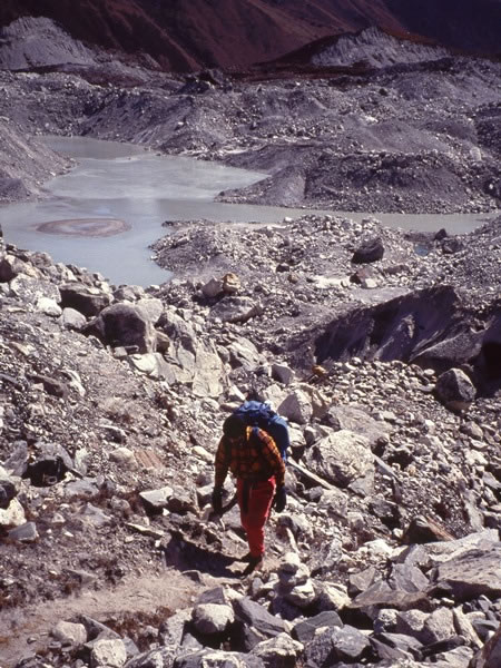 Sunday, 20 October 1991 – From Gokyo to the foot of the Cho La pass: We left Gokyo at 9:00 am, trekked down the valley to a spot where we could safely cross the Ngozumpa glacier, and then headed east to the foot of the Cho La pass. As I wrote in my diary, crossing the Ngozumpa glacier “took the better part of an hour and was not especially easy. We wound our way up and down huge dunes of moraine atop the ice.” In this photograph, Dave Little can be seen making his way slowly up one of the moraine dunes. |