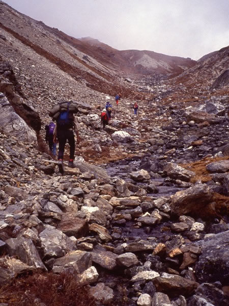 Sunday, 20 October 1991 – From Gokyo to the foot of the Cho La pass: Heading up towards a ridgeline that we had to cross in order to get to the foot of the Cho La pass. The ridge was 5,130 metres feet above sea-level, and so – for the third day in a row – we went above the five thousand metre mark. |