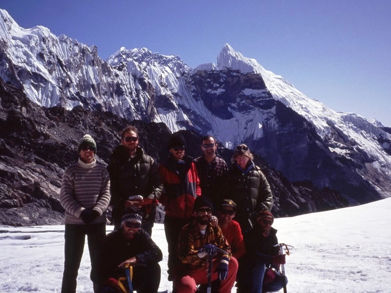 Monday, 21 October 1991 – From the foot of the Cho La pass to our Lobuje East base camp: We had a group photograph taken at the top of the pass, which was just as well, because it was the highest point reached by all nine members of our team. Squatting in front (from left to right) are Rod, Dave, Mike, and Jon; standing (from left to right) are me, Geoff, Ralph, Eric, and Diane. Lobuje East, our expedition’s primary goal, is the peak towering above Diane Cowan’s head. |