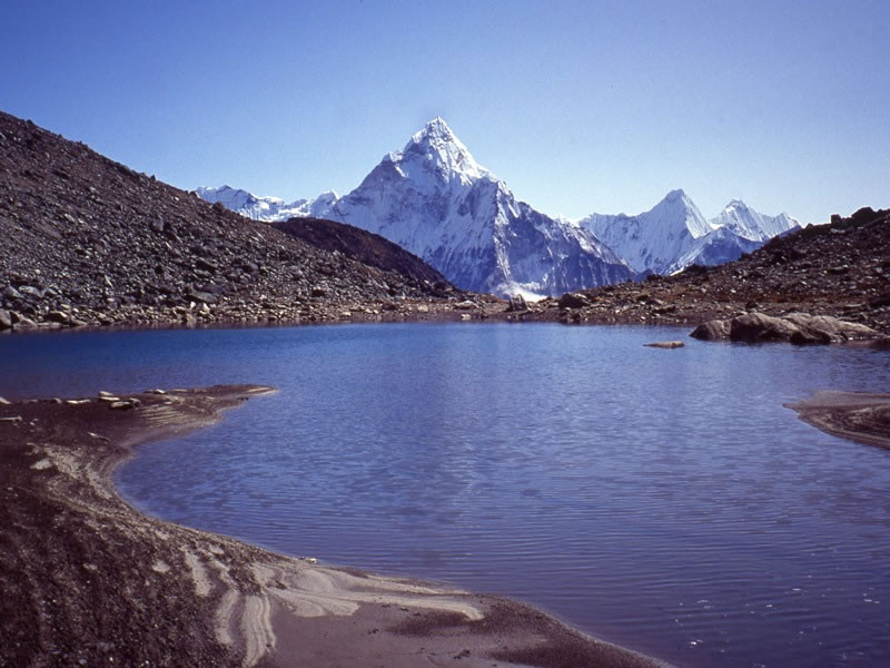 Tuesday, 22 October 1991 – Based at our Lobuje East base camp: Our expedition’s advanced base camp – or high camp – was on the shores of this small mountain tarn that is sometimes called “Hidden Lake” in books about climbing and trekking in Nepal. The striking triangular peak in the centre of the picture is Ama Dablam. |