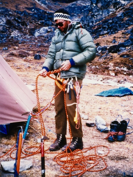 Tuesday, 22 October 1991 – Based at our Lobuje East base camp: At base camp in the afternoon, Rod practised his knots – ironically, though, he was the member of the expedition who least needed to do so. Rod was an accomplished cross-country skier, and his snow-craft skills were clearly superior to everyone else’s. |