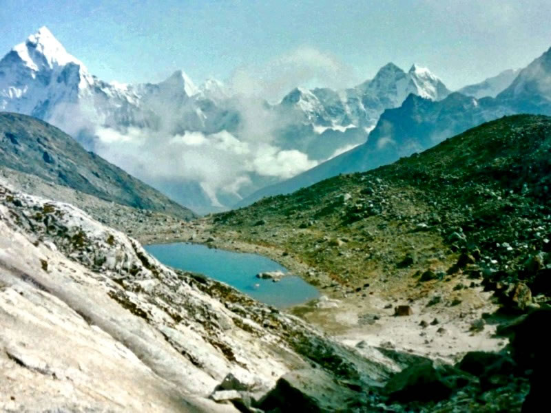 Wednesday, 23 October 1991 – From our Lobuje East base camp to our advanced base camp: Diane took this photograph looking down onto Hidden Lake and our tents (which are to the right of the part of the tarn that’s nearest the camera). Advance base camp was 5,245 metres above sea-level, and the 365-metre climb to it from base camp took us just over an hour and twenty minutes. |