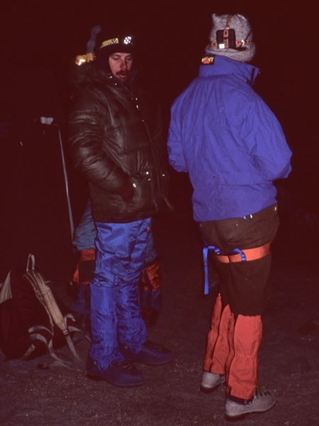 Thursday, 24 October 1991 – Our Lobuje East summit attempt: We were woken at 2:00 am and had some hot, spicy soup. The temperature was only about -5 degrees C, so getting dressed wasn’t particularly painful. I then had some porridge and a cup of drinking chocolate. I took this photograph of Ralph (on the left) and Rod shortly before we set off at 4:00 am. |