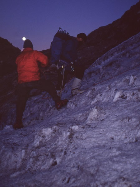 Thursday, 24 October 1991 – Our Lobuje East summit attempt: As I recorded in my diary, “Torch troubles were endemic. Almost all of them failed.” Thankfully, however, there was a full moon, and it was bright enough for us to see – as can be seen in this photograph that I took of Rinzing (in the red jacket) and Dave tackling a small band of icy rocks. |