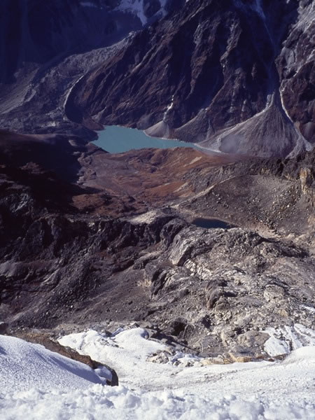 Thursday, 24 October 1991 – Our Lobuje East summit attempt: We left our highpoint at about 10:30 am and made our way back down to the main ridge, where I took this photograph looking down the 180-metre or so snow slope we’d climbed roughly four hours earlier and that we were going to abseil down. In the middle of the picture, about one-third the way in from the right-hand edge, the site of our advanced base camp – Hidden Lake – is clearly visible. Far below it (but seemingly above it in this photograph) are the milky-blue waters of a glacial lake at the foot of Taboche. |