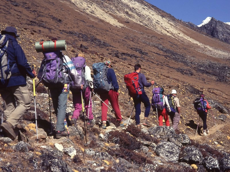 Friday, 25 October 1991 – From our Lobuje East base camp to Dingboche: I clambered down off the trail to take this photograph of the trekkers we were stuck behind. They were a prime example of what the members of one climbing expedition we’d met had contemptuously referred to as “two-stick tossers.” |