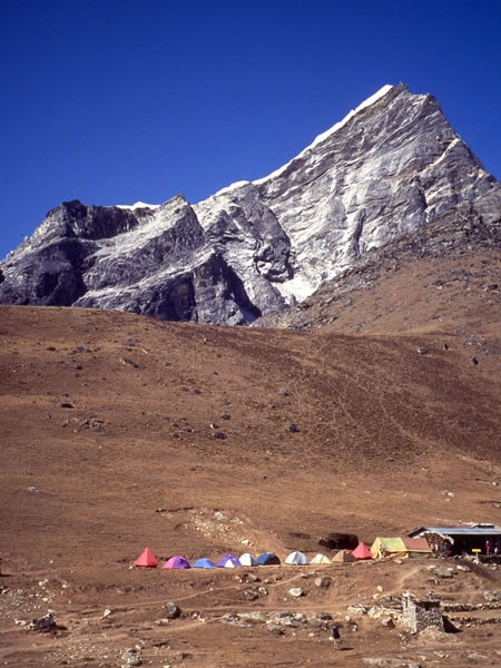 Lobuje village and an adjacent campsite below the sheer cliffs of the east face of Lobuje East.