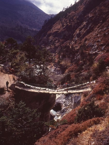 After walking down the true right bank of the Imja Khola river for most of the morning, we had to cross the river on this rickety swing bridge festooned with prayer-flags.