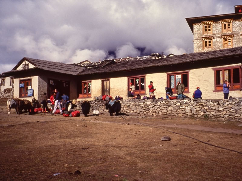 Sunday, 27 October 1991 – From Thyangboche to Namche Bazar: … the monastery’s lodge, formally called the Tengboche Gompa Lodge. This is a photograph that I took of the lodge after breakfast on Sunday morning, 27 October. To the right of the yaks, from left to right on the lodge’s front porch are Rod (sitting), Eric (with the red hat), Ralph, Jon, Geoff, Mike (sitting with his back to the camera), and Diane. |