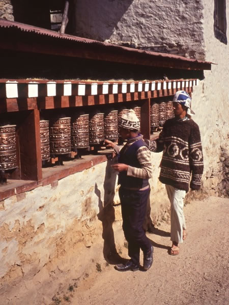 People walking past the prayer wheels push them gently, making the wheels rotate and thus send prayers to the deities.