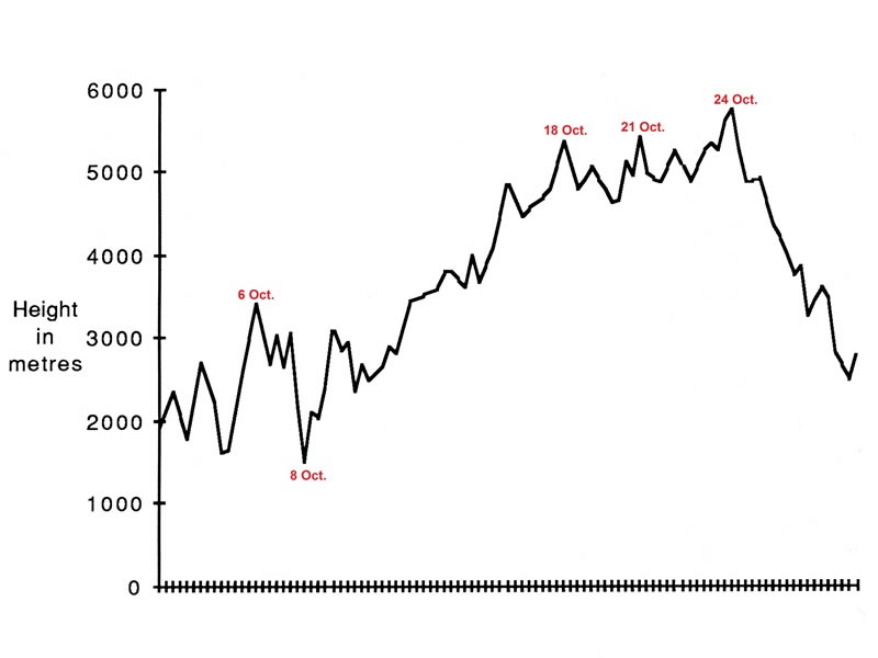 Tuesday, 29 October 1991 – From Namche Bazar to Lukla: … I have constructed this graph to give an overall perspective to the ascents and descents we made during the four weeks in which we trekked from Jiri via Namche Bazar and Gokyo to Lobuje East, and then – after our unsuccessful attempt to climb the mountain – our trek via Thyangboche and Namche Bazar to Lukla. The lowest point on the graph was when we crossed the Dudh Kosi river for the first time on 8 October 1991. Prominent highpoints include the Lamjura La (i.e., pass) which we crossed on 6 October; Gokyo Ri, which we climbed on 18 October; the Cho La, which we crossed on 21 October and which was the highest point reached by all nine members of our expedition; and our highpoint on Lobuje East on 24 October 1991. As the graph shows, we went up and down a great deal, and that was really good for our acclimatisation. From my own perspective, one of the wonderful things about the trip was that I did not experience any symptoms of altitude sickness (such as headaches and nausea). The trek and the climb gave me the confidence to continue climbing, and the phrase “Climb high; sleep low” became a mantra of mine. |