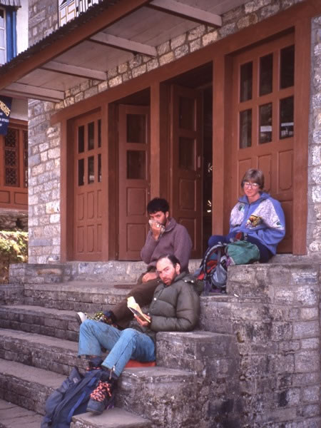 Wednesday, 30 October 1991 – From Lukla to Kathmandu: We had to be ready by 8:30 am and prepared to get on a plane at a moment’s notice. After that – as I recorded in my diary – “all we could do was wait … wait … and wait …”, which is what Rod, Geoff (in the front), and Diane were doing when I took this photograph of them sitting on the steps of the Hotel Sagarmatha. We had drawn lots to determine the order in which we would get on a flight. Jon won first position, followed by Diane, Rod, Geoff, Eric, Mike, me, and Ralph. |