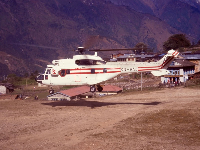 Wednesday, 30 October 1991 – From Lukla to Kathmandu: Some people flew out of Lukla on this large helicopter. I was offered the possibility of a seat on it on condition that I paid an extra $US30.00, which was a sum of money that I simply didn’t have. By this stage of the expedition – our last day in the Khumbu – all the cash I had amounted to only 342 rupees (which was the equivalent of about $US10.70). |