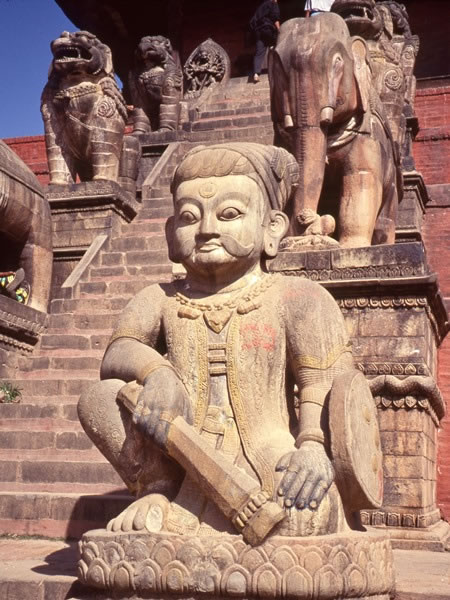 Thursday, 31 October 1991 – Bhaktapur: The two guards at the foot of the Nyatapola temple (one of whom is the closest figure to the camera) are reputed to have the strength of ten men, but the elephants above them are ten times stronger than the guards. The lions on the third level are ten times stronger than the elephants, and the griffins above them are ten times stronger than the lions. Finally, ten times stronger than the griffins, the demigoddesses on the fifth level are the ultimate guardians of the entrance to the inner sanctum of the temple. |