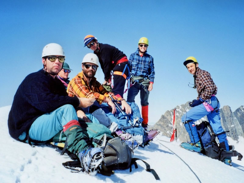 After the expedition: Our experiences on Lobuje East showed us that we really needed to upgrade our climbing skills, and as a result I arranged for five of us to go on a six-day April 1993 climbing course in the Southern Alps of New Zealand. This photograph was taken on the summit of Hochstetter Dome (2,810 metres above sea-level) by JR (namely, John Roberts), one of our two Alpine Guides’ instructors. From left to right are Geoff, Gerry Kennedy (our other instructor), Dave, Rod, me, and Eric. |