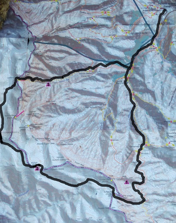 This photograph of part of Otto’s map shows the route we took. On Day 1, we left the Injisuthi Hutted Camp and – by and large – headed south past the turnoff to Marble Baths, up to Centenary Hut, and then on for another three kilometres or so to our first campsite (marked by purple triangle 1). On Day 2, we climbed Judge Pass and entered Lesotho, then made our way west to the ridge between Injisuthi Dome (3,410 metres / 11,187 feet) and Mafadi (3,450 metres / 11,319 feet). We dropped down on to the eastern side of the ridge, and – because the ridge is the watershed line and thus the boundary between Lesotho and South Africa – we were back into South Africa, where we pitched our tents and spent our second night. On Day 3, we headed up to the summit of Mafadi, which is situated on the border between South Africa and Lesotho. We then hiked north-west along the border between the two countries before descending into Lesotho. We crossed the border again for the final time, back into South Africa, at Leslie’s Pass, which was our steep descent route due east down the Drakensberg escarpment. Our third and final campsite was at the foot of Leslie’s Pass. On Day 4, we walked east down the Njesuthi river, past Marble Baths, and then – after reaching the junction of the two trails – we headed north, retracing our steps back to the Injisuthi Hutted Camp. |